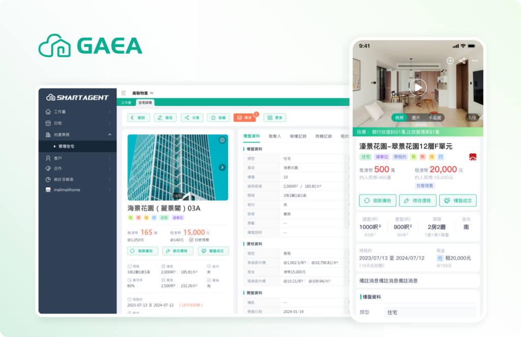 GAEA.net 物業管理系統,擁有最全的樓書數據; 提供方便的放盤及找房的平臺,並連接地產仲介的地產系統,提供最即時最新的樓盤資訊和物業資訊